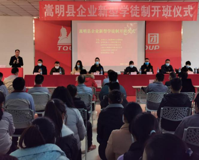 为加快建设知识型、技能型、创新型劳动者队伍,进一步深化产教融合,完善企业技能人才培养机制,近日,在嵩明县人社局的指导下,嵩明县“企业新型学徒制”培养班开班仪式在昆明铁骑力士饲料有限责任公司举行。昆明铁骑力士饲料有限责任公司、云南合信源机床有限责任公司、云南瑞升纸业有限公司、昆明明珠环保科技有限公司领导及师徒代表共计40余人参加开班仪式。
